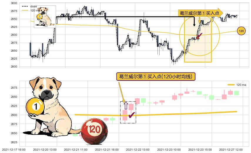 形态多维评估: ⚀ 2021-12-22 09:00:00-小时显现 葛兰威尔均线 120小时均线 第买①入点 走势反转见底信号,后市看涨,买进信号