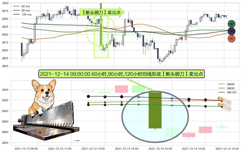 形态多维评估: ⚀ 2021-12-14 09:00:00小时显现 60小时-90小时-120小时均线 【断头铡刀】卖出点 看空信号,后市看跌,卖出