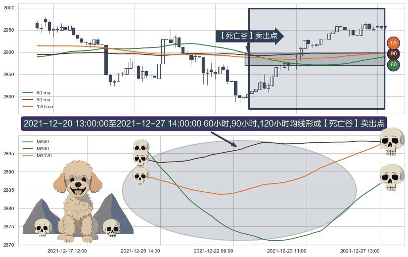形态多维评估: ⚀ 2021-12-20 14:00:00-小时至2021-12-27 14:00:00-小时显现 60小时-90小时-120小时均线 【死亡谷】卖出点 看空信号,后市看跌,卖出