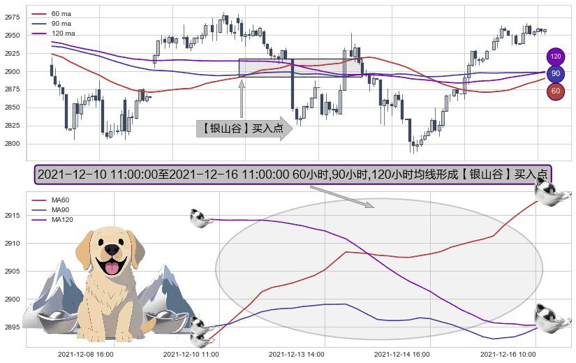 形态多维评估: ⚀ 2021-12-10 12:00:00-小时至2021-12-16 11:00:00-小时显现 60小时-90小时-120小时均线 【银山谷】买入点 看多信号,后市看涨,买入