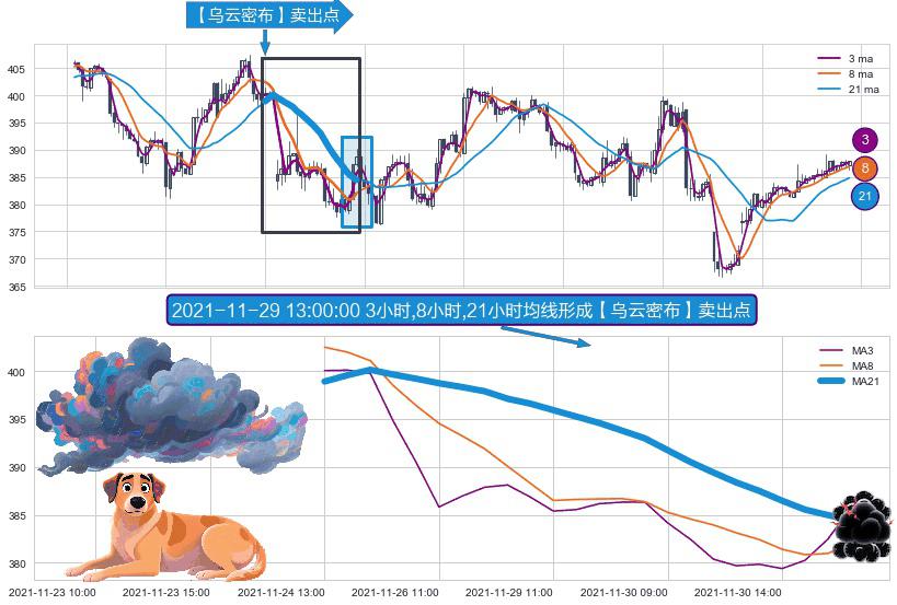 形态多维评估: ⚀ 2021-11-24 13:00:00小时-2021-12-01 10:00:00小时显现 3小时-8小时-21小时均线 【乌云密布】卖出点 看空信号,后市看跌,卖出