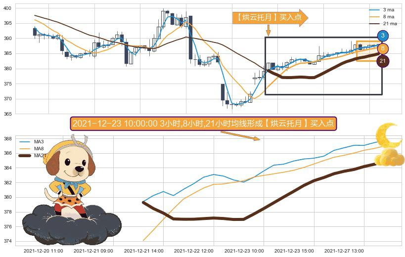 形态多维评估: ⚀ 2021-12-21 12:00:00小时-2021-12-27 15:00:00小时显现 3小时-8小时-21小时均线 【烘云托月】买入点 看多信号,后市看涨,买入