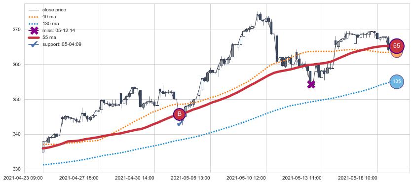 上涨趋势04-23 09:00-05-18 15:00,均线55确认关键支撑1处