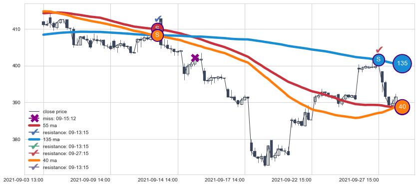 下跌趋势09-03 13:00-09-28 13:00,均线135, 40, 55确认关键阻力2处