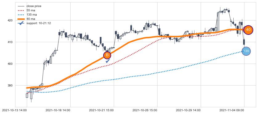 下跌趋势11-04 09:00-11-22 15:00,均线40, 55确认关键阻力2处