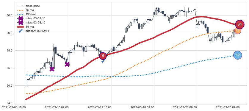 ⚁ MA3和MA8走势平行,且始终保持在短距离内,MA21始终在短中期均线上方,与短中期均线保持一定的距离,微微下行