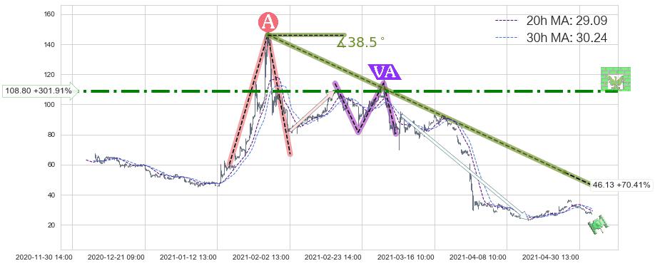 ♘ 在最后的下跌阶段2021-01-27 13:00至2021-04-27 11:00,存在 持续未破位的阻力位 ,阻力价格46.13,可信任强度78.66%,其距离最后价格27.07相差 +70.41%