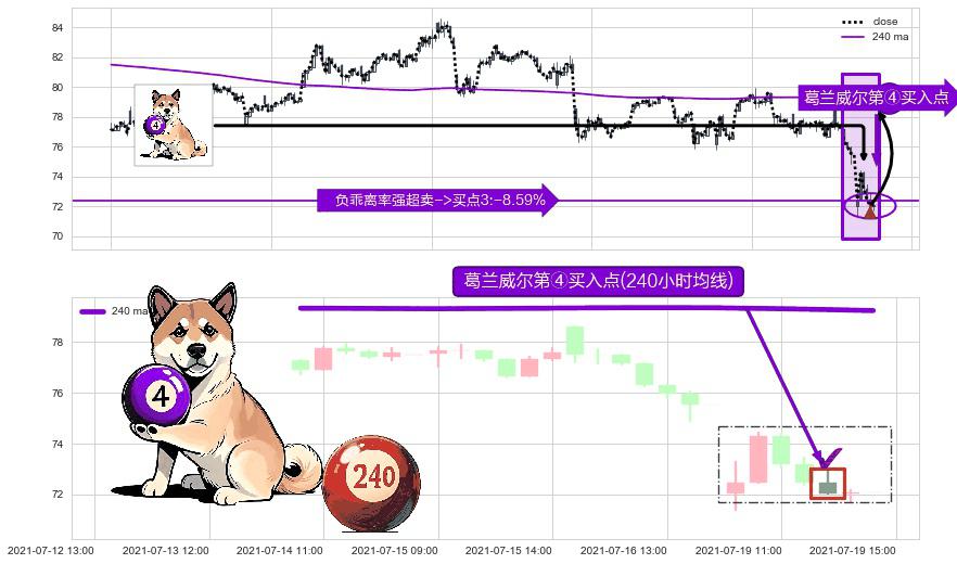 形态多维评估: ⚀ 2021-07-19 13:00:00-小时显现 葛兰威尔均线 240小时均线 第④买入点 下降趋势均值回复的短线反弹信号,后市看涨,买进信号