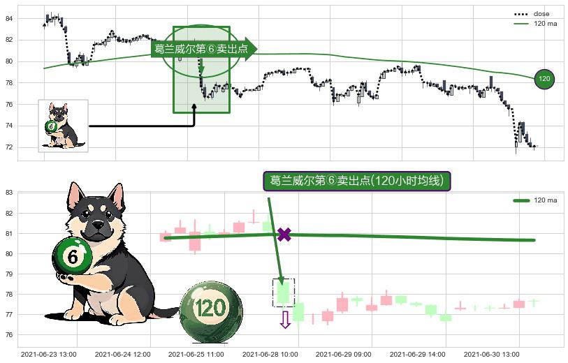 形态多维评估: ⚀ 2021-06-28 09:00:00-小时显现 葛兰威尔均线 120小时均线 第⑥卖出点 走势反转见顶信号,后市看跌,卖出信号