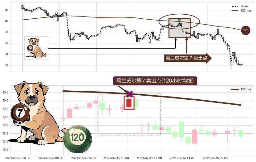 形态多维评估: ⚀ 2021-07-12 13:00:00-小时显现 葛兰威尔均线 120小时均线 第⑦卖出点 下降趋势的中继信号,后市看跌,卖出信号