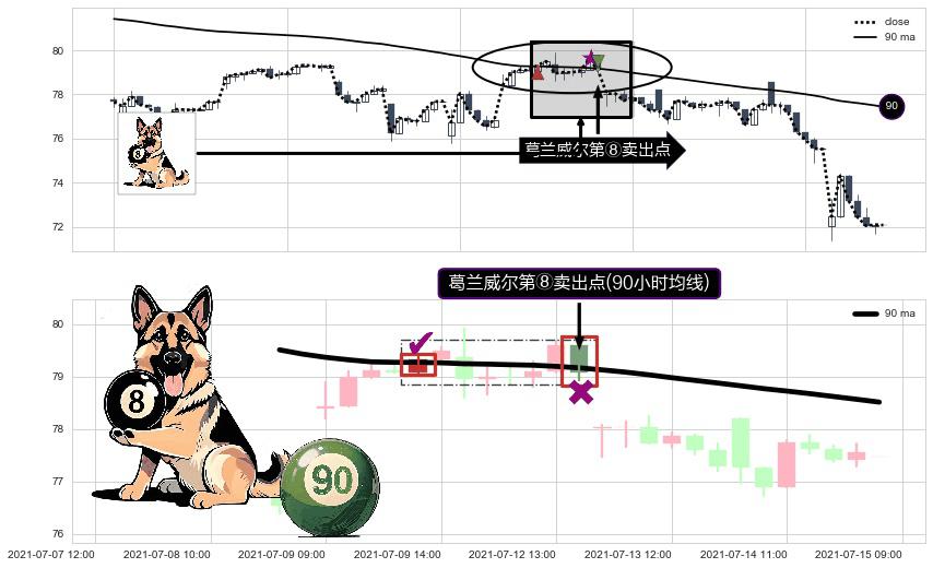 形态多维评估: ⚀ 2021-07-12 14:00:00-小时显现 葛兰威尔均线 90小时均线 第⑧卖出点 下降趋势的中继信号,后市看跌,卖出信号