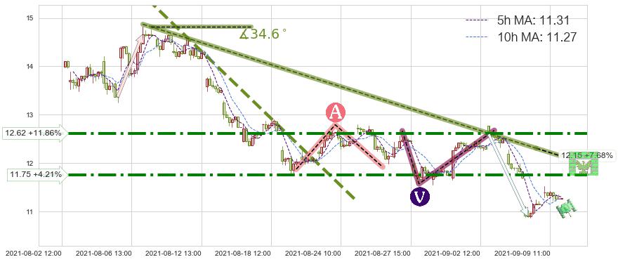 ➣ 预测:2021-09-20 13:00,【试探阻力】稳定目前下跌趋势的前提下,预测价格:11.17