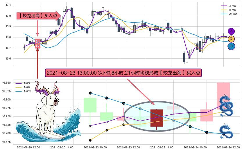 形态多维评估: ⚀ 2021-08-23 13:00:00小时显现 3小时-8小时-21小时均线 【蛟龙出海】买入点 看多信号,后市看涨,买入