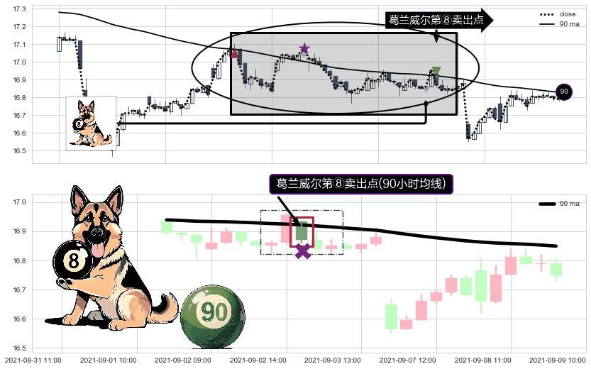 形态多维评估: ⚀ 2021-09-03 09:00:00-小时显现 葛兰威尔均线 90小时均线 第⑧卖出点 下降趋势的中继信号,后市看跌,卖出信号