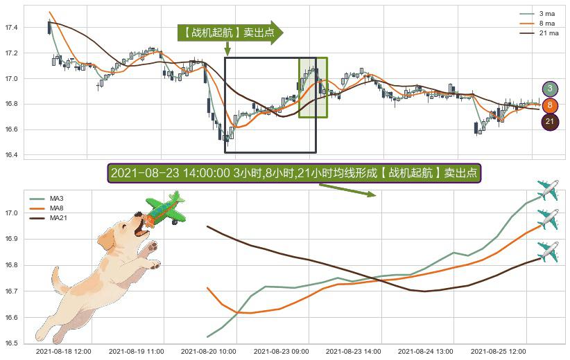 形态多维评估: ⚀ 2021-08-19 14:00:00小时-2021-08-25 13:00:00小时显现 3小时-8小时-21小时均线 【战机起航】卖出点 看空信号,后市看跌,卖出