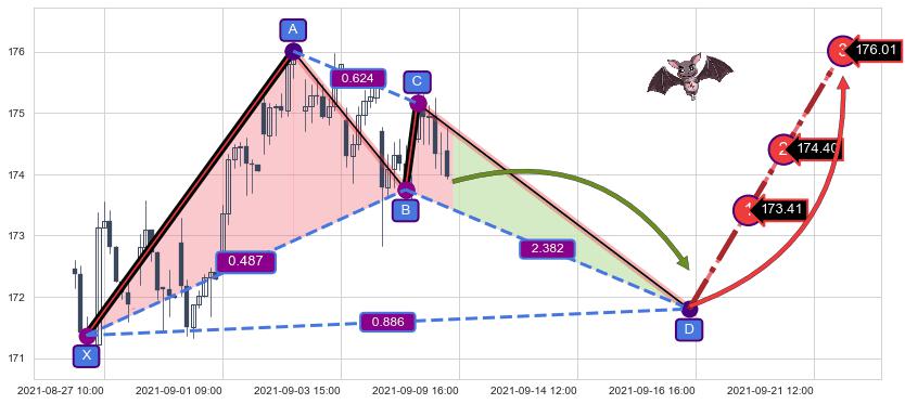 ➢ 距离预测D点位置尚有下跌空间,短线依然【看跌】, 耐心等待看涨【蝙蝠】形态反转启动