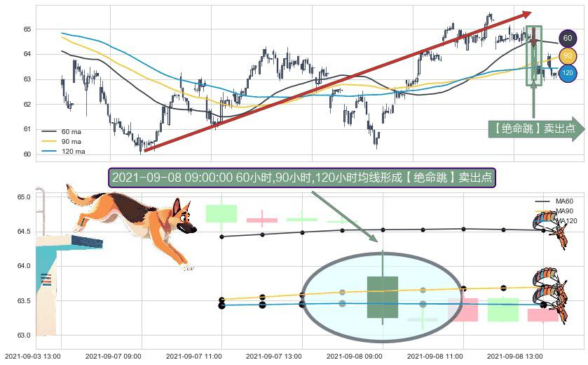 形态多维评估: ⚀ 2021-09-08 09:00:00小时显现 60小时-90小时-120小时均线 【绝命跳】卖出点 看空信号,后市看跌,卖出