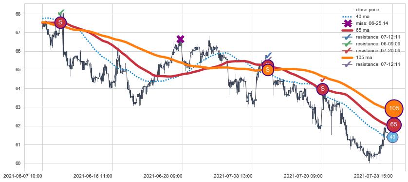 下跌趋势04-21 13:00-05-27 09:00,均线40, 65确认关键阻力3处