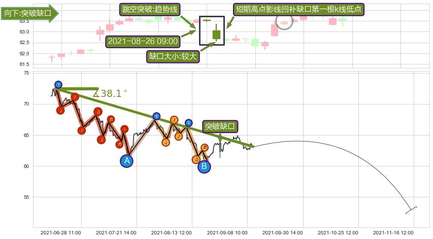 从2021-06-17 09:00至2021-08-25 09:00,共包含291个小时,阶段股价下跌-12.35%,阶段股价变动位移路程比: 1 : 9,下跌趋势角度: 38.1