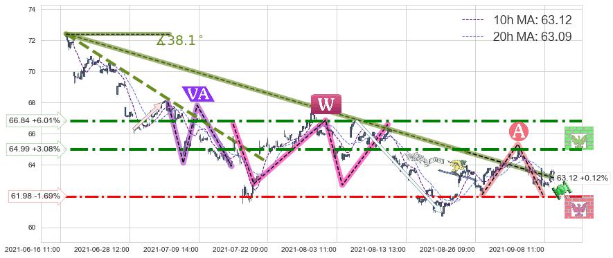 🦴 长线均值回复组合短线趋势跟踪[强阻力信号]2021-06-17 09:00-2021-08-25 09:00下跌趋势依然成立(下跌趋势跟踪依然存在),短线价格略微上行反弹(均值回复猜想),即将接近下跌趋势提供的未破位阻力价格:63.12。