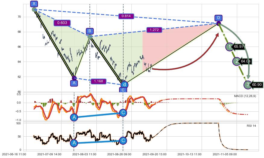 ➣ D点拟合预测价格69.11,距离最后交易收盘价格63.05相差 +9.61%