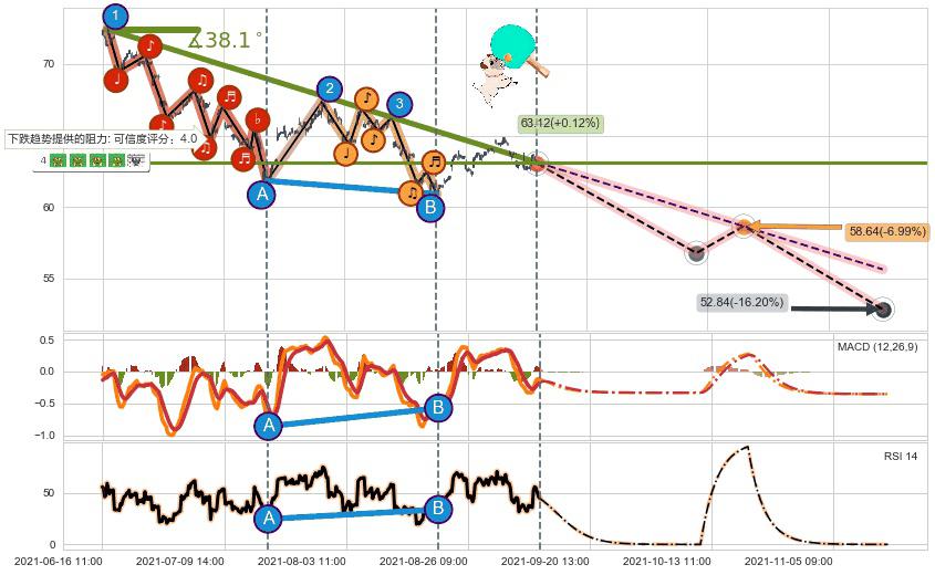 ♘ 阻力价格位64.99,可信任强度72.13%,距离最后交易2021-09-09 14:00形成的收盘价格63.05相差 +3.08%