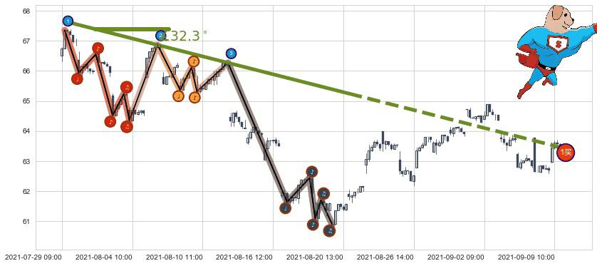 ➣ 2021-07-29 10:00-2021-08-23 09:00下跌趋势存在反转上涨[机会],虽然原下跌趋势的阻力位(63.41)已被突破,但其阻力效果尚存,原下跌趋势角度: 32.3˚