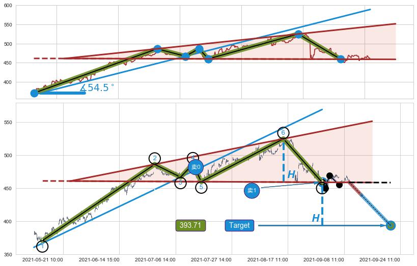 ➣ 最小反转跌幅→𝐇: 52.59 (头部与颈线垂直距离)