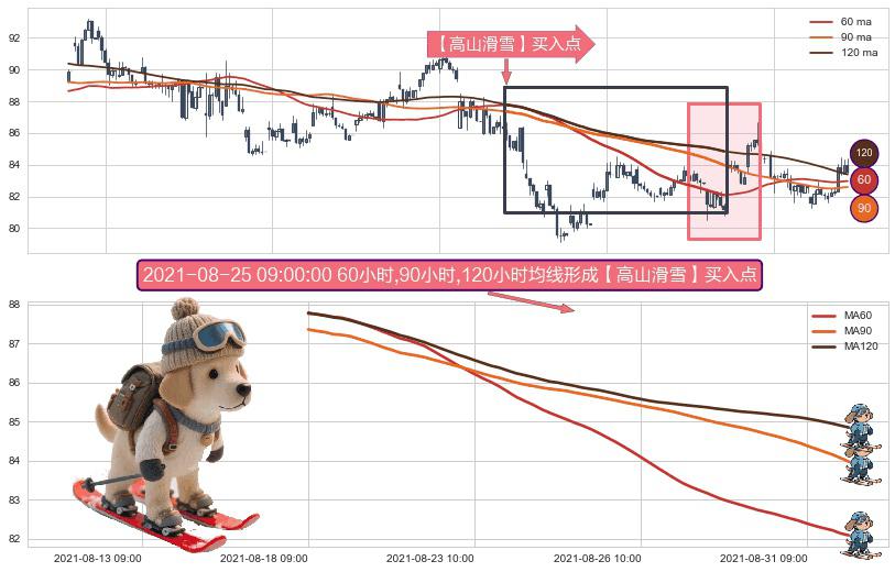 ⚀ 2021-08-18 09:00:00小时-2021-08-31 14:00:00小时显现 60小时-90小时-120小时均线 【高山滑雪】买入点 看多信号,后市看涨,买入