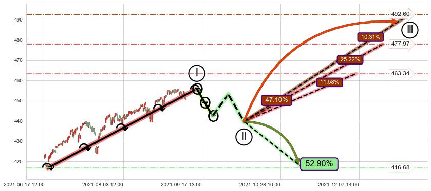 ➢ 高概率大级别循环上涨浪被破坏,反转向下(突破5浪起点)概率52.90%