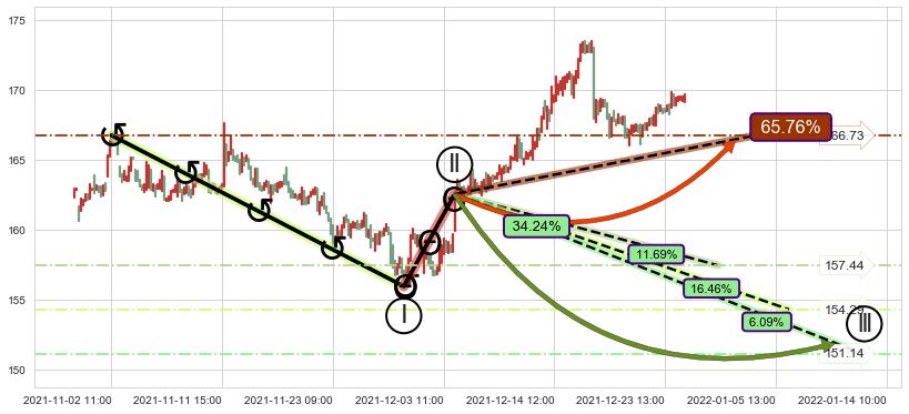 ➢ 循环浪继续向下【最高】位置(12-30:11, 157.44),匹配聚类样本比例34.14%, 可能性概率11.69%