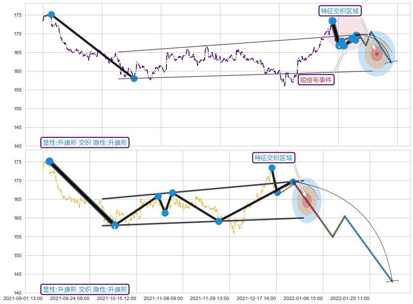 从2021-12-08 13:00至2021-12-21 10:00,共包含61个小时,阶段股价上涨1.83%,阶段股价变动位移路程比: 1 : 10
