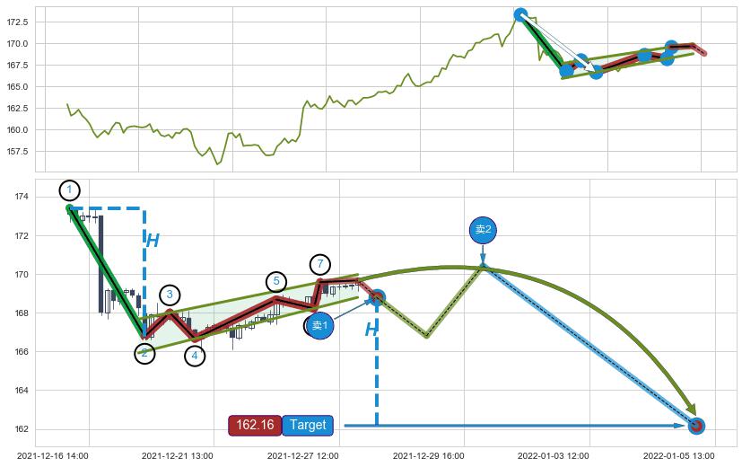➢ 【仅预测突破】最后价格:169.67与预测突破价格:168.79→【空间临近】后续最小【整理】第一目标价格→(01-05:13: 162.16 )