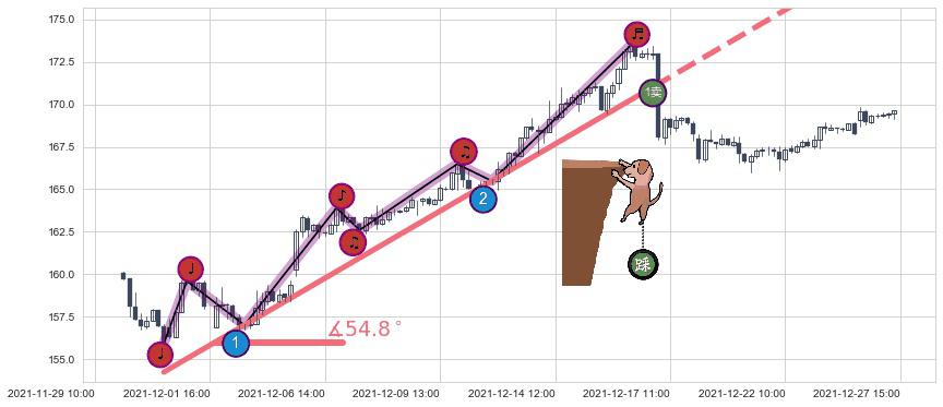 从2021-11-30 15:00至2021-12-16 15:00,共包含86个小时,阶段股价上涨10.45%,阶段股价变动位移路程比: 1 : 2,上涨趋势角度: 54.8