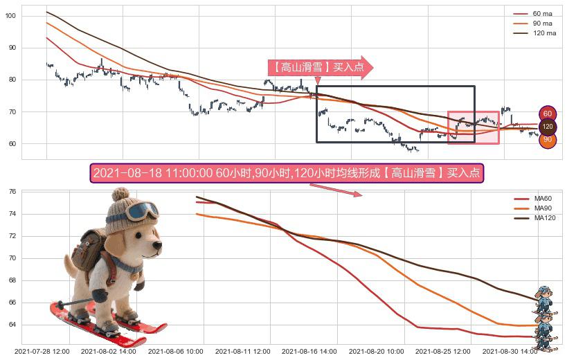 ⚀ 2021-08-05 14:00:00小时-2021-08-30 14:00:00小时显现 60小时-90小时-120小时均线 【高山滑雪】买入点 看多信号,后市看涨,买入