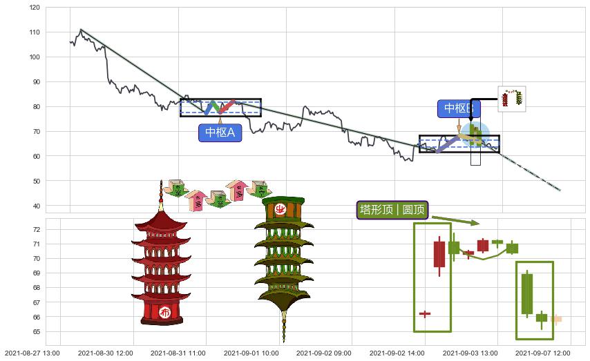 | 3 🅚:下跌两颗星 | 下跌三颗星 ➕ ☯️:缠论中枢点下降缠中枢B破位后距离1买距离较远,随后猜想后续持续下跌(趋势跟踪) ☞ 看空信号 ⇥ 【🅚线】交织【图形】⇥ 综合量化分数: 42 | > |