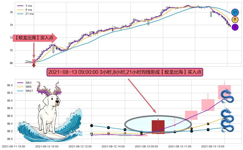 形态多维评估: ⚀ 2021-08-13 09:00:00小时显现 3小时-8小时-21小时均线 【蛟龙出海】买入点 看多信号,后市看涨,买入