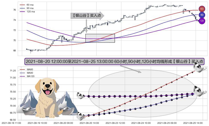 形态多维评估: ⚀ 2021-08-20 13:00:00-小时至2021-08-25 13:00:00-小时显现 60小时-90小时-120小时均线 【银山谷】买入点 看多信号,后市看涨,买入