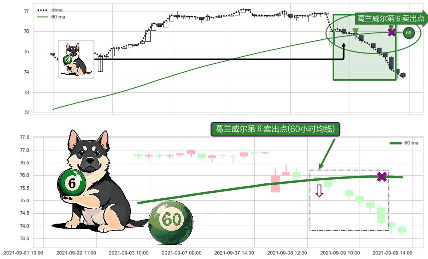 形态多维评估: ⚀ 2021-09-08 13:00:00-小时显现 葛兰威尔均线 60小时均线 第⑥卖出点 走势反转见顶信号,后市看跌,卖出信号