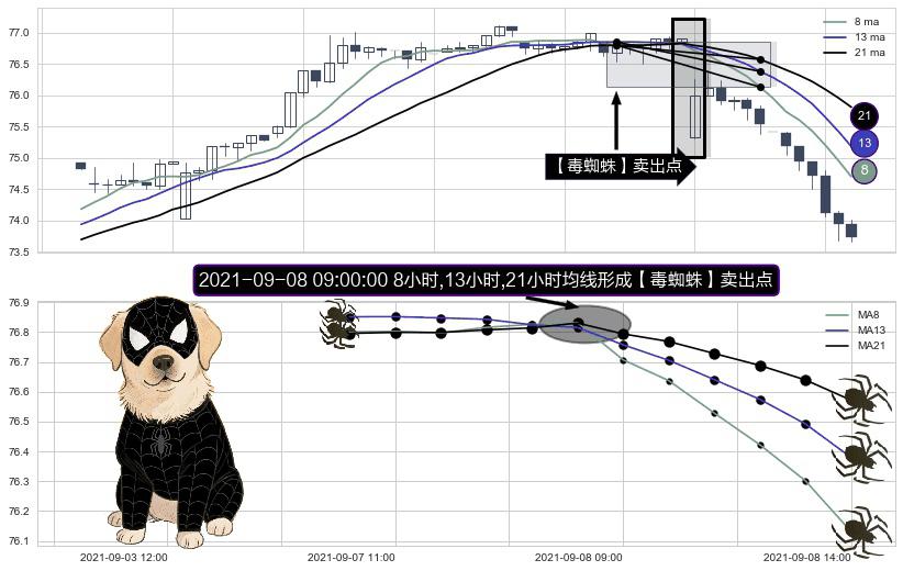 形态多维评估: ⚀ 2021-09-08 09:00:00小时显现 8小时-13小时-21小时均线 【毒蜘蛛】卖出点 看空信号,后市看跌,卖出