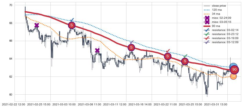 下跌趋势02-22 12:00-04-01 09:00,均线90确认关键阻力4处