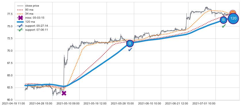 上涨趋势04-19 11:00-07-07 15:00,均线120确认关键支撑2处