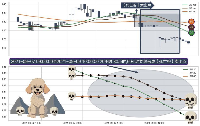 形态多维评估: ⚀ 2021-09-07 10:00:00-小时至2021-09-09 10:00:00-小时显现 20小时-30小时-60小时均线 【死亡谷】卖出点 看空信号,后市看跌,卖出