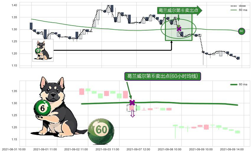 形态多维评估: ⚀ 2021-09-07 09:00:00-小时显现 葛兰威尔均线 60小时均线 第⑥卖出点 走势反转见顶信号,后市看跌,卖出信号
