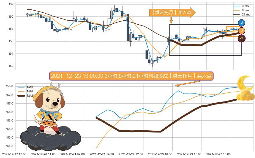 形态多维评估: ⚀ 2021-12-21 11:00:00小时-2021-12-27 15:00:00小时显现 3小时-8小时-21小时均线 【烘云托月】买入点 看多信号,后市看涨,买入
