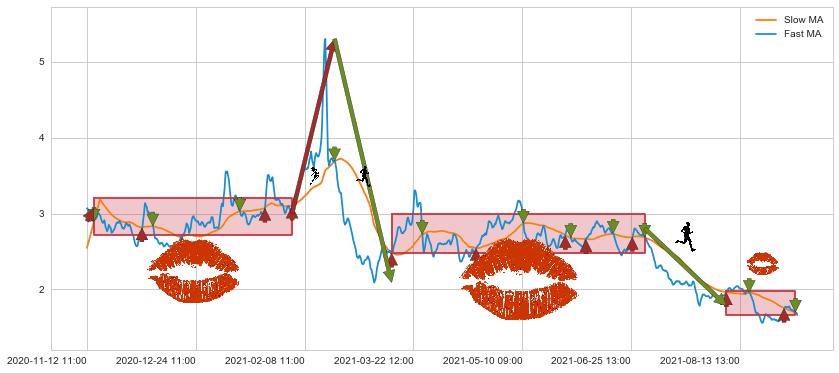 03-12 09:00至07-01 14:00 慢线与快线多次接触,存在上下穿越,有缠绕