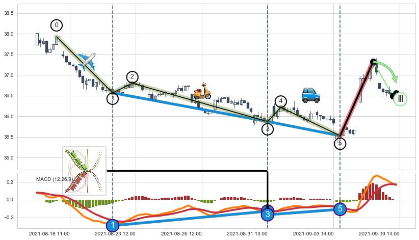 从2021-08-02 10:00至2021-08-04 11:00,共包含14个小时,阶段股价下跌-4.53%,阶段股价变动位移路程比: 1 : 1.6,2021-08-04 09:00向↘︎形成缺口,跳空下跌-3.57%˚