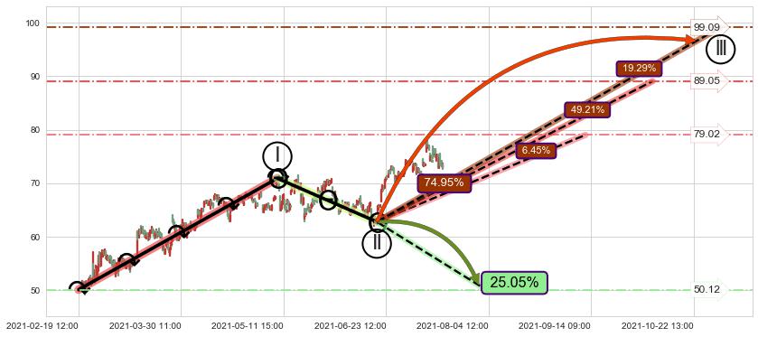 从2021-03-15 11:00至2021-03-26 09:00,共包含61个小时,阶段股价上涨2.79%,阶段股价变动位移路程比: 1 : 17