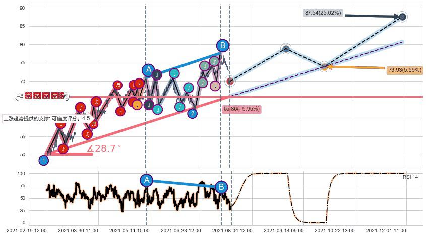 ♘ 在最后的上升阶段2021-02-19 12:00至2021-07-12 12:00存在 持续未破位的支撑位 ,支撑价格65.86,支撑可信任强度86.47%,其距离最后价格70.02相差 -5.95%