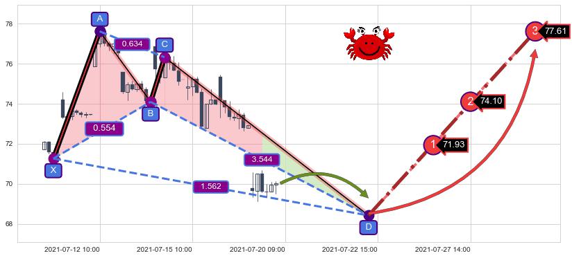 ➣ 未完成【螃蟹】形态起点X: 07-08:13, 已到达C点: 07-14:11, 预测最终D点: 07-22:13, 共65交易小时